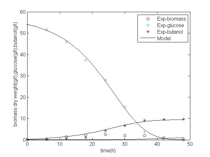 legend('Exp-biomass','Exp-glucose','Exp-butanol','Model'),