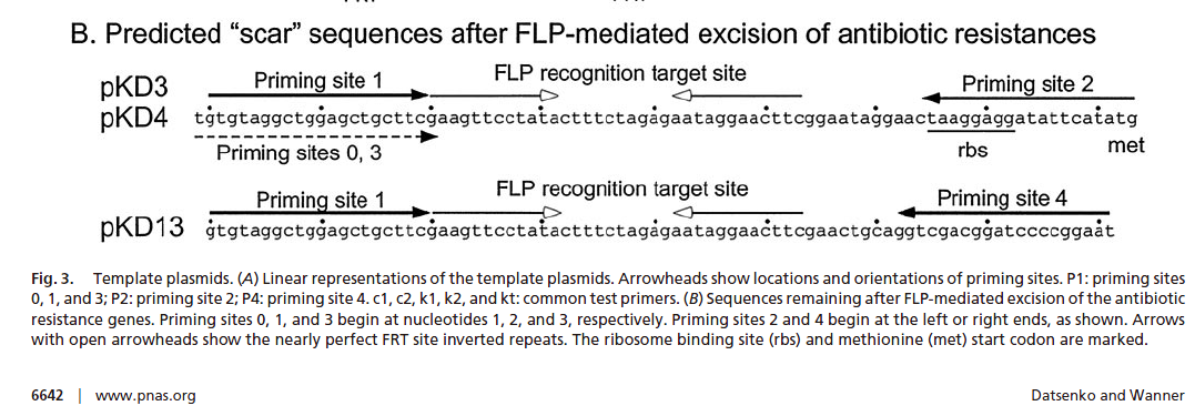 http://www.ncbi.nlm.nih.gov/nuccore/15554332 KA Datsenko,One-step inactivation of chromosomal genes in Escherichia coli K-12 using PCR products,PNAS,2000 FLP recognition target即为FRT [ Last edited by 602059625 on 2011-12-5 at 20:33 ] |