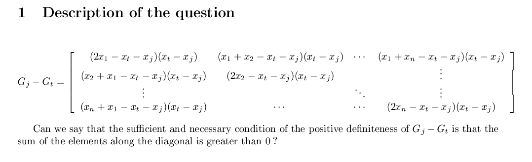 在推导过程中遇到一个疑问,见下图,式子稍微有点复杂,但简而言之,我的问题是:对称矩阵的主对角线上元素之和大于0是否是该对称矩阵为正定矩阵的一个充分条件?教材上貌似没有找到相关的定理或者推论,但是感觉可能有相关结论,敬请赐教,不胜感激! [ Last edited by 自然卷在发愣 on 2011-12-5 at 23:52 ] |