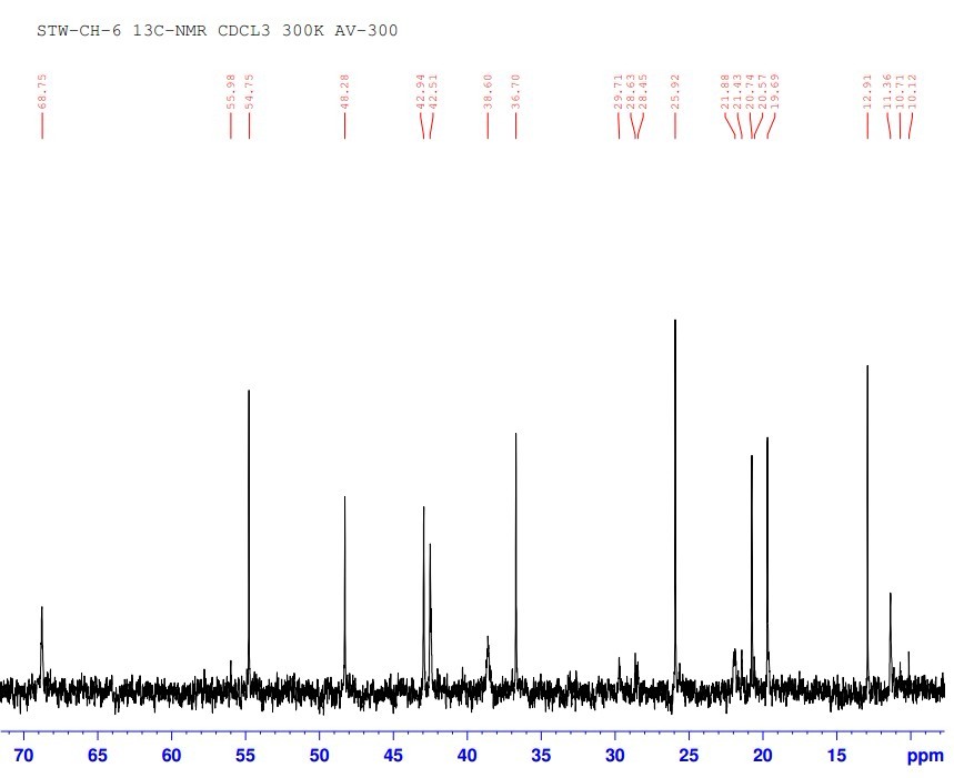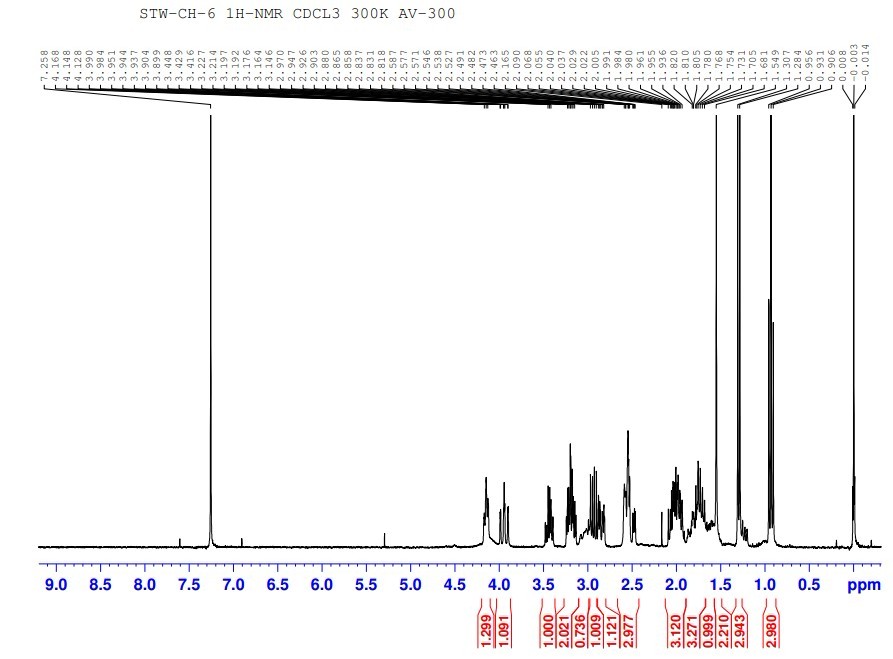 求解一化合物有H、C氢谱 打谱溶剂:氘代氯仿 核磁:300M 该化合物为一针晶,365nm无荧光,254nm无暗斑,硫酸-乙醇不显色,碘蒸气显色,植物来源为百部科植物对叶百部 H谱中1.5左右2个氢应该是水峰 求达人帮忙解析,给出意见也非常感激 H谱 H谱 H谱 C谱 C谱 [ 来自科研家族 Natural Products家族 ] |