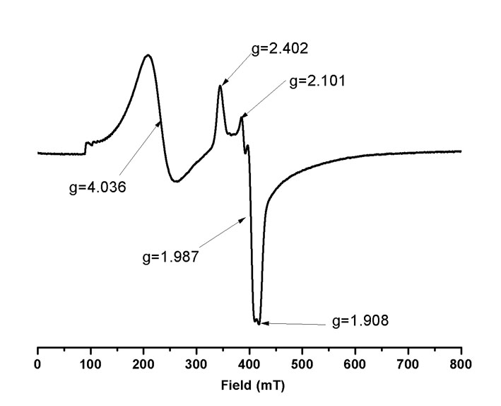 测试了一个ESR,如图,其中有四种配位的Fe,两种3价Fe,两种2价Fe,具体如下: 1.Fe3+一种是四面体配位的,一种是八面体配位的,配原子都是O原子; 2.Fe2+都是八面体配位的,只是第一种是和一个N原子核5个O原子配位,第二个是4个N原子核2个氧原子配位。 请帮忙分析一下,谢谢了。 |