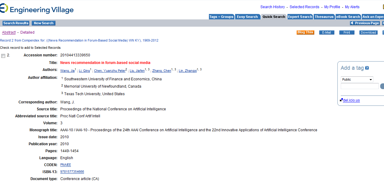 1. User comments for news recommendation in forum-based social media 作者: Li, Q (Li, Qing); Wang, J (Wang, Jia); Chen, YP (Chen, Yuanzhu Peter)1; Lin, ZX (Lin, Zhangxi)2 来源出版物: INFORMATION SCIENCES 卷: 180 期: 24 页: 4929-4939 DOI: 10.1016/j.ins.2010.08.044 出版年: DEC 15 2010 被引频次: 1 (来自 Web of Science) 引用的参考文献: 33 [ 查看 Related Records ] 引证关系图 摘要: News recommendation and user interaction are important features in many Web-based news services. The former helps users identify the most relevant news for further information. The latter enables collaborated information sharing among users with their comments following news postings. This research is intended to marry these two features together for an adaptive recommender system that utilizes reader comments to refine the recommendation of news in accordance with the evolving topic. This then turns the traditional "pushdata" type of news recommendation to "discussion" moderator that can intelligently assist online forums. In addition, to alleviate the problem of recommending essentially identical articles, the relationship (duplicate, generalization, or specialization) between recommended news articles and the original posting is investigated. Our experiments indicate that our proposed solutions provide an improved news recommendation service in forum-based social media. (C) 2010 Elsevier Inc. All rights reserved. 文献类型: Article 语种: English 作者关键词: News recommendation; Recommender system; Content-based filtering; Collaborative filtering; Social media; User comment; Information retrieval 地址: 1. Mem Univ Newfoundland, St John, NF A1C 5S7, Canada 2. Texas Tech Univ, Lubbock, TX 79409 USA 电子邮件地址: kooliqing@gmail.com 基金资助致谢: 基金资助机构 授权号 Scientific Research Starting Foundation for Returned Overseas Chinese Scholars National Natural Science Foundation of China (NSFC) 60803106 Fok Ying-Tong Education Foundation, China 121068 Natural Sciences and Engineering Research Council (NSERC) of Canada 303958-2010 [显示基金资助信息][隐藏基金资助信息] This work has been supported by the Scientific Research Starting Foundation for Returned Overseas Chinese Scholars, the National Natural Science Foundation of China (NSFC) (Grant No. 60803106), the Fok Ying-Tong Education Foundation, China (Grant No. 121068), and the Discovery Grants of Natural Sciences and Engineering Research Council (NSERC) of Canada (No. 303958-2010). 出版商: ELSEVIER SCIENCE INC, 360 PARK AVE SOUTH, NEW YORK, NY 10010-1710 USA Web of Science 分类: Computer Science, Information Systems 学科类别: Computer Science IDS 号: 677DA ISSN: 0020-0255 2.没有SCI检索信息。 [ Last edited by imyourkobe on 2011-12-9 at 10:12 ] |