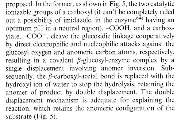 第一贴有个地方有错,第二个更准确点 如前面图5所示,羧基(-COOH)和羧酸盐(-COO-)的两个催化电离群(在酶存在于中性区的优化pH的条件下,不能完全排除咪唑的可能性) 采用直接对葡萄糖上氧原子和异构碳原子分别进行 亲电和亲核进攻的方式 协助性的将葡萄糖苷连接位点进行剪切,通过一个异构体倒置形成的简单置换 导致共价β-葡糖酶复合物的形成。结果,β-羧基-乙缩醛键被水中的羟基离子置换从而停止水解,并通过两倍置换保持产物的异构体结构。两倍置换机制充分的解释了这个保持物质异构体结构的反应。 |