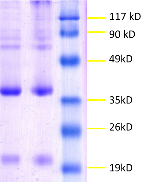 最近在sigma上买了Lipase B Candida antarctica, recombinant from Aspergillus oryzae。跑了个SDS-PAGE,结果出来比较明显的三个条带,中间那个是CALB,其他两个就不清楚是什么了。不知道有没有虫友也做过这个酶的表征,谢谢~ |