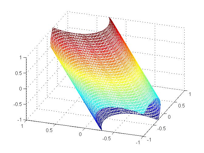 那这个空间圆柱体又该怎么处理呢? (x-y)^2+(y-z)^2+(z-x)^2=1 还有这个稍微复杂点的, 方程是这样写的, (((x-y)^2+(y-z)^2+(z-x)^2)/2)^0.5+2*0.01*1.2375*exp((x+y+z)/3/1.2375)=1 不知道该怎么样才能搞定,特来请教各位大侠。 |