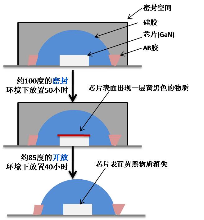 如附件图片所示: 问题:这种黄黑色的物质,有可能是因为高温下硅胶和AB胶反应引起的么? 如果是, 1、为什么该黄黑物质没有出现在硅胶和AB胶东界面出,而是出现在芯片表面;硅胶是将芯片密封起来的; 2、为什么开放环境中放置40小时,黄黑物质又消失? 3、如果分析,请各位赐教! 请各抒己见! 感谢你们的回复; 问题如图,求助! |