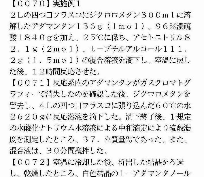 在2L四颈烧瓶的溶解于二氯甲烷136克300毫升金刚烷(1mol),加入96%浓硫酸1840克,保持在25℃,滴加乙腈82.1克(2mol),叔丁醇,111。2G(1.5mol)混合溶液,恢复到室温后,反应12小时。 在确认了反应体系内金刚烷在气相色谱法的消失后,蒸馏去除二氯甲烷,在4L四颈烧瓶预备的60℃水2620克里滴入反应溶液。滴完后,通过规定的基于氢氧化钠水溶液滴定测量,硫酸浓度为37.9%质量。此外,搅拌混合液30分钟。 经室温冷却,过滤析出晶体,干燥的时候获得白色晶体的1 - 金刚烷147克醇(收益率97%,气相色谱法(下称GC)99.5%纯度)。 |