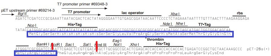 本人合成了一段全基因序列,连接表达载体pET28a(+),因为第一次做,错误的选择了EcoR1和Hind3作为酶切位点(红色标记),这样表达出的目的蛋白就会带有大量的载体氨基酸(蓝色框),影响活性。不知道哪位高人能够指点一些,该怎样处理才能保证蛋白活性?谢谢!! |