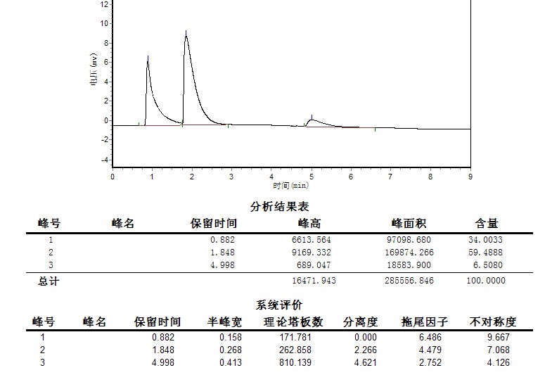 各位高手,我用气相色谱测甲醛水溶液,含量是37%-40%,TCD检测器,进样口温度是120,汽化室:80,检测器:120,可是出来的峰很郁闷啊,有2个峰,含量有97.65%,搞不懂了,请高手指点! 甲醛水溶液的气相图 |
