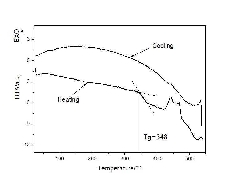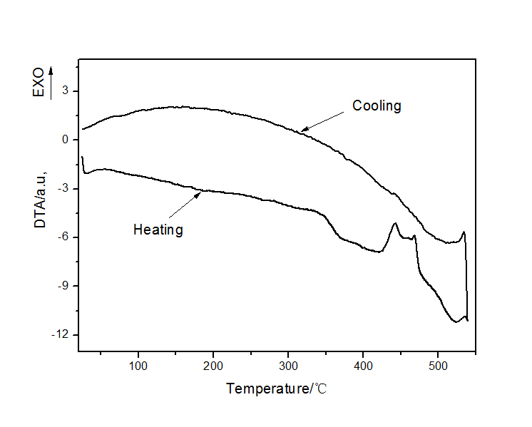 目前对玻璃材料也不是很了解,虽有看祥光的文献和书籍,但还是定不出所研究的玻璃的玻璃转变点,望各位虫友,多帮帮忙,都指点指点!谢谢了。 这是我玻璃样品的DTA曲线,从25度升温到540度,升温速率为5度每分钟,在Ar气的保护下。 |