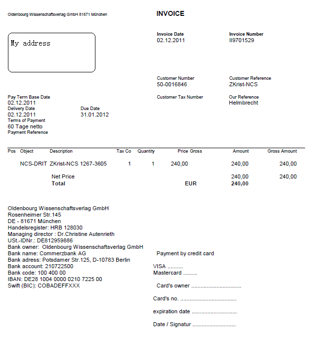 如果楼主借到了朋友的中行卡,不管是Visa还是Mastercard,要保证是人民币欧元双币信用卡,就可以省去刷人民币美元双币信用卡的汇率转换费。不过我觉得二三十人民币应该算小事吧,毕竟用自己的卡方便一些。 拿到卡后,填写Payment by credit card部分 先勾选Visa或者Master,然后持卡人姓名,然后16位卡号,然后是有效期,最后是签名+日期。填完之后可以扫描,发email给对方或者传真过去,这样快。如果楼主不放心,就填好之后寄国际挂号信给对方也行。 |