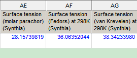 MS中synthia模块计算表面张力,计算结果有三个分别是: 1. molar parachor 2.fedors 3.van krevelen 不知道这三个值分别代表什么? 有没有计算表面张力的色散项和极性项? |