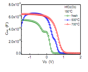 下面是Al/HfO2/SiO2/Si/Al MOS电容的C-V测试曲线,在500℃退火后,积累区电容急速下降,这个怎么理解?