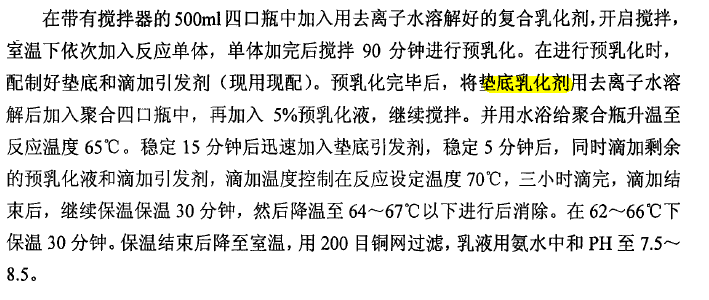 | 关于这个垫底的说法,一般采用打底一说,打底乳化剂就是和水,缓冲剂放在一起,一般打底的乳化剂是你整个配方的四分之一左右,另外引发剂因为久置会失效,做的预乳化工艺,这个不是很难,只有你看别人做过一次就好了,问题是乳化剂种类要选好,否则有可能容易凝胶,引发剂一般是整个配方的0.2-0.8%,假设你采用0.6%的引发剂,刚开始加到釜底一般是0.2%左右,代5%预乳化液发生反应产生蓝光后,保温15min钟左右,也就是保证后续加料不爆聚,就是让体系温度稳定,再慢慢滴加余下的单体和引发剂溶液,网上也有些基础配方,每个配方的工艺有差别,但是也有相似的地方,基本原理是一致。想知道楼主做什么乳液聚合? |