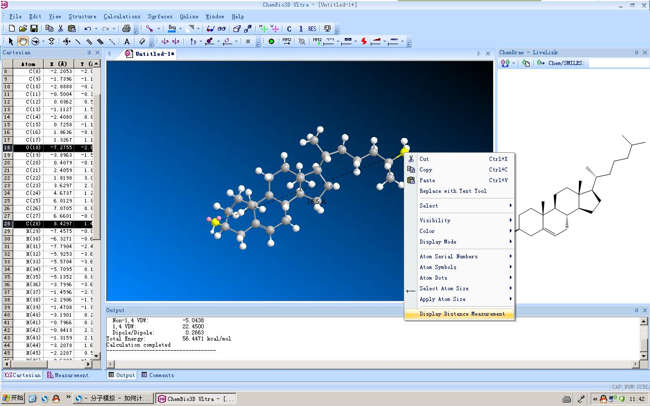 本人对模拟完全是门外汉。呵呵。 现在课题需要计算几个分子结构。一个是油酸分子,一个是胆固醇分子。(下图附件)想知道它们的分子大小。 另外还想知道如果单纯一个烷基分子大概要多少个C原子的长度能够与这两个分子相当? 最好能详细点的计算步骤,谢谢! ![]() 如果有大侠能算好,我将不胜感激。呵呵 |