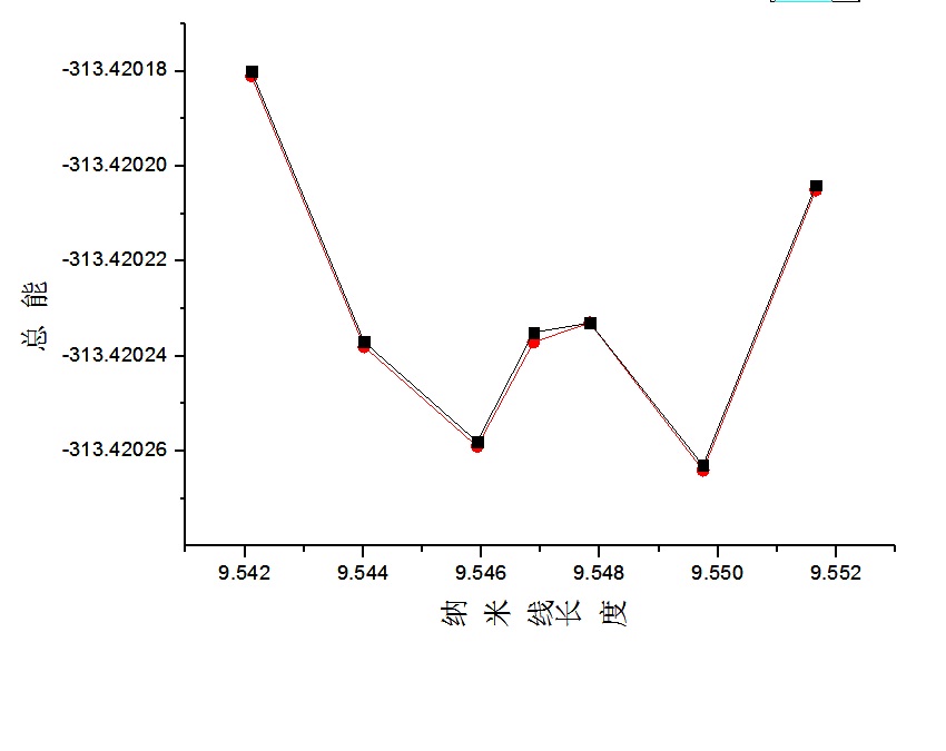 我算了一个纳米线的总能-长度图如下。按理说这个图应该是呈抛物线形的。可是现在不是抛物线形的,具体形状如下,大侠们帮忙看看怎么回事啊? 计算中的精度为 EDIFF=1E-7 EDIFFG=-0.0001 先谢谢了! [ Last edited by liliangfang on 2012-1-11 at 11:10 ] |