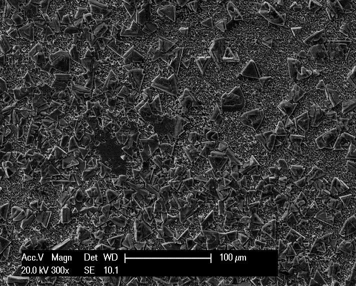 你好,想请问在你的“铜涂层,用盐酸刻蚀,大约20秒后,图中的现象怎么回事?”这个帖子中那些未被侵蚀的类三角形颗粒是什么成分?如果是纯铜,被盐酸腐蚀之后为什么会留下这么规则的颗粒?这些颗粒是什么相?