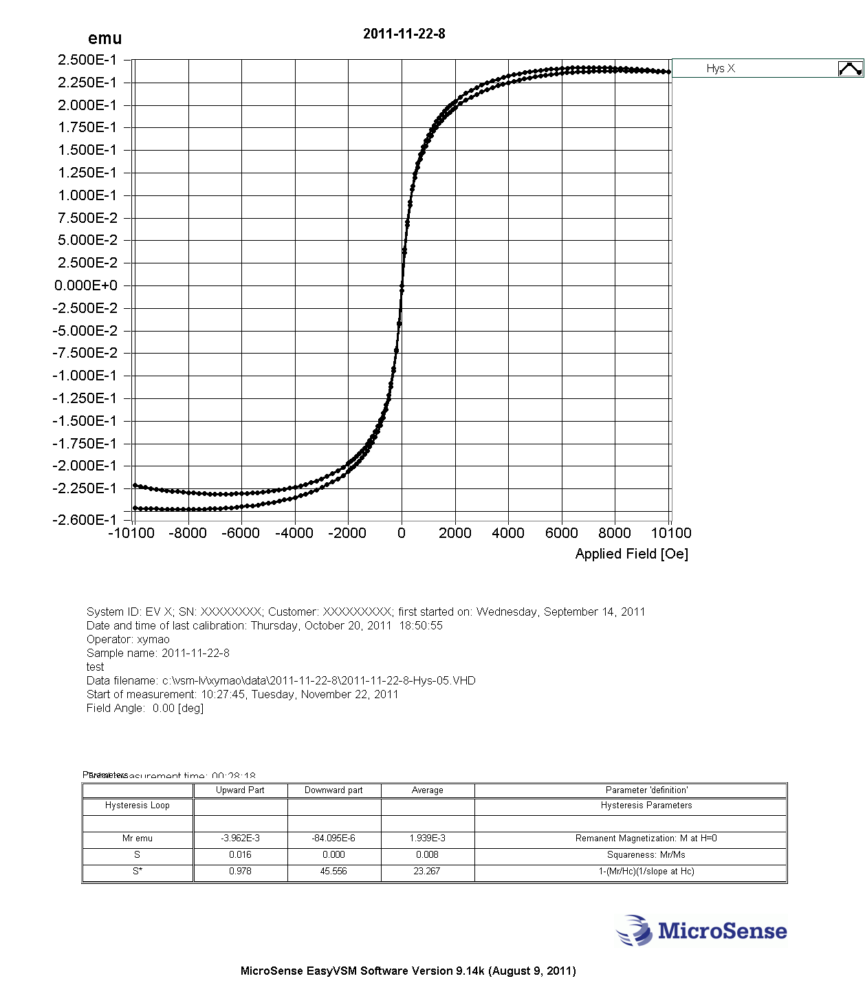 最近测量了纳米四氧化三铁的磁滞回线,但是我对磁学一窍不通啊,给出的图怎么和文献上的差很大啊,特别是如果按图中y轴的数据直接除以样品质量的话饱和磁强度太低了。样品质量为0.1g左右。 质量为0.0986 |