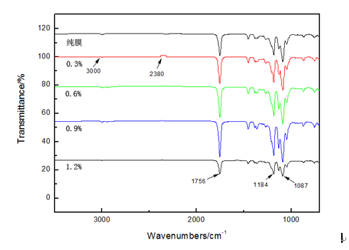| 大家帮忙分析一下,刚接触不是很懂。含不同浓度SiO2的PLA/SiO2的薄膜红外光谱图 |