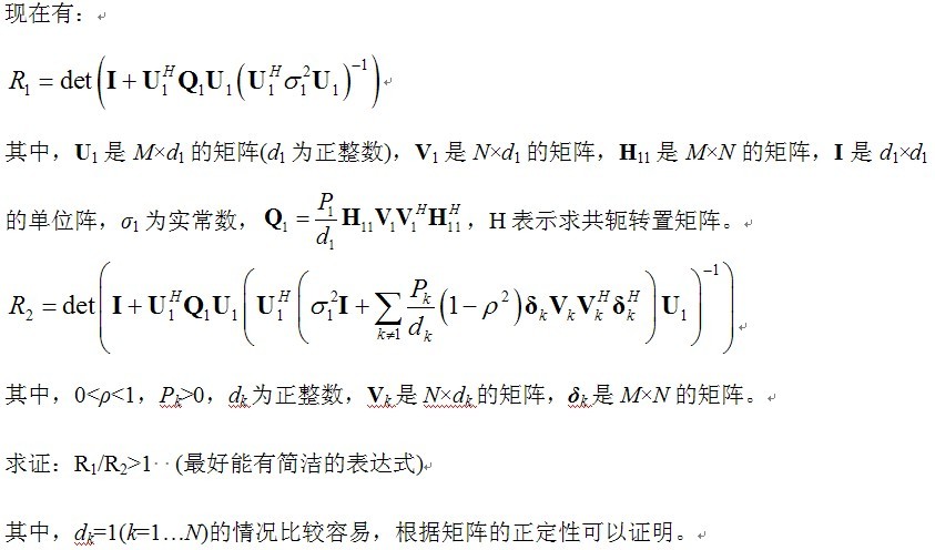 楼主你好,针对你的另一个帖子中的最后一个询问,我想帮你解释如下 【还是没有完全看明白证明。再问你一点吧,这可能是最让我迷惑的一点,如果这一点明白了,估计就明白了。也就是你所说的Q,Q=U_1^HQ_1U_1(U_1^HU_1)^(-1),为什么是正定的,这个我一直想不明白,能解释一下吗?】: (1)正如jfili 所言,R_1/R2>1 应为R_1/R_2>=1; (2)并不要求Q为正定阵,只需注意到如下结论即可:det(I+AB)=det(I+BA). 事实上,将Q=U_1^HQ_1U_1(U_1^HU_1)^(-1)视为AB,这里A=(U_1^HQ_1U_1)^(1/2),B=(U_1^HQ_1U_1)^(1/2)(U_1^HU_1)^(-1). 楼主能明白吗? |