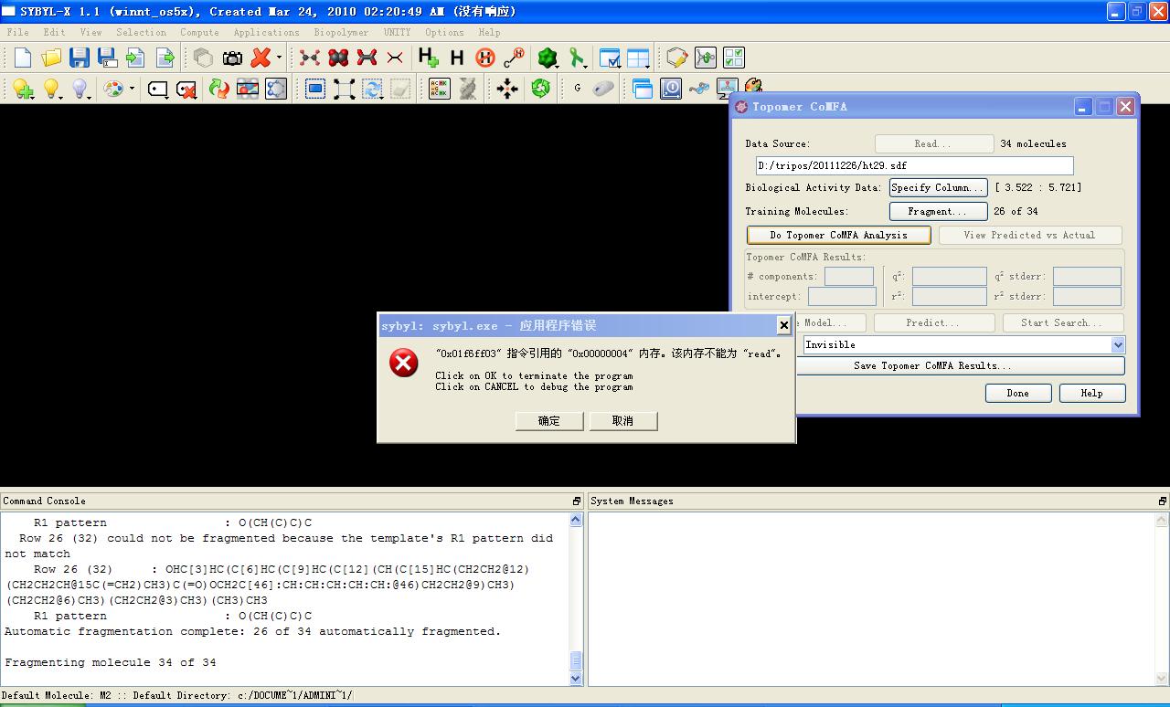 sybyl-x 1.1,windows版本,以前用没有问题。昨天出了如下问题: 在运行 topomer comfa的时候,弹出:sybyl.exe 应用程序出错。如图所示。 我尝试运行了Minimize,没有问题。 多次尝试COMfa失败后,我重装了一次软件,依然还是那个问题。 想请教大家该如何解决? 我怀疑是不是我电脑突然缺少了什么文件呢? 出错信息 |