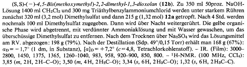 (S, S)-(-)-4,5-双 (甲氧基甲基) -2,2-二甲基-1 ,3-二氧戊烷 (12b). 向剧烈搅拌下的350ml的50%的氢氧化钠溶液,1400ml二氯甲烷和300mg氯化三乙基苯乙胺混合溶液中加入320 ml (3.2 mol)硫酸二甲酯,然后滴加215 g (1.32 mol)12a。4小时后,另外加入100毫升硫酸二甲酯,继续搅拌过夜。黄色的有机相分出,用稀氨水和水洗涤去除过量的硫酸二甲酯,经过无水硫酸钠干燥后,溶液在旋转蒸发上浓缩可得到198 g (79%). 减压蒸馏 (bp 49度/ 0.15 Torr), 可以得到168 g(67%)。后面的红外、旋光、核磁我就不翻译了 (S, S)-(-)-1,4-二甲氧基-2 ,3-丁二醇(13a) 100 g (0.527 mol)的12b,200ml甲醇和200毫升2N HCl在75度加热5分钟,然后,甲醇和盐酸在浴温75度下旋转蒸发减压去除,粗产率73.4 g (93%),沸点68度/0.2 Torr,Mp 28度。后面的红外、旋光、核磁我就不翻译了 |