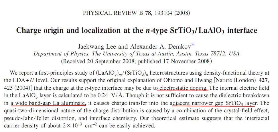 LaAlO3/SrTiO3界面体系的研究高潮已经快过去。有关这个体系的理论研究的综述可 Electronic Phenomena at Complex Oxide Interfaces: Insights from First Principles R. Pentcheva and W. E. Pickett J. Phys.: Condens. Matt. 22, 043001 (2010) 。W. E.Pickett组同其合作者对这个体系做的工作远比A. A. Demkov多。A. A. Demkov这个组做的东西都很细致。 |