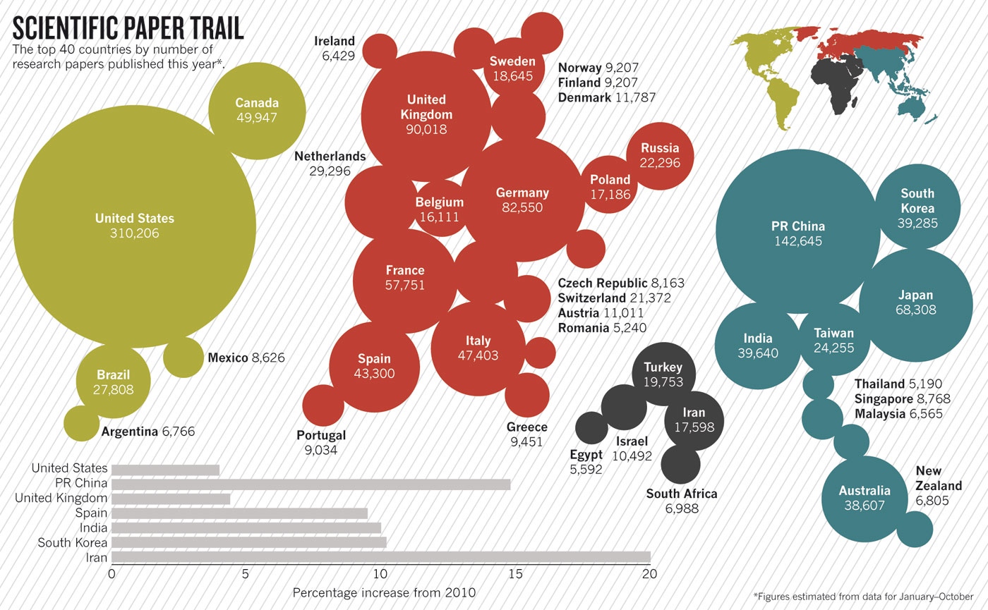For science — as for politics and economics — 2011 was a year of upheaval, the effects of which will reverberate for decades. The United States lost three venerable symbols of its scientific might: the space-shuttle programme, the Tevatron particle collider and blockbuster profits from the world's best-selling drug all came to an end. But the year also saw stirrings of science's future: hopes that research might blossom following the Arab Spring; cheap vaccines rolling out in Africa; and the first fruits of genome sequencing being used in the clinic. All this was overshadowed by the triple trauma of Japan's devastating earthquake, tsunami and nuclear meltdown, and a continual chipping away at science funding as nations struggled with the financial crisis. http://www.nature.com/news/365-days-2011-in-review-1.9684 中国现在已是论文大国,文章发表仍然在加速度也很快啊! |