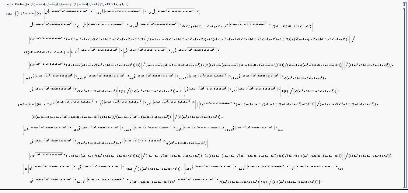 用mathematica软件可以求解: DSolve[{x'[t] == A x[t] + B y[t] + C, y'[t] == D x[t] + E y[t] + F, x[0] == K, y[0] == K}, {x, y}, t] // Simplify 答案是: x -> Function[{t}, (2 E^(-(1/ 2) (A + E + Sqrt[A^2 + 4 B D - 2 A E + E^2]) t) (-2 B C D E^( 1/2 (A + E + Sqrt[A^2 + 4 B D - 2 A E + E^2]) t) + 2 B C D E^((A + E + Sqrt[A^2 + 4 B D - 2 A E + E^2]) t) + 2 B C D E^( Sqrt[A^2 + 4 B D - 2 A E + E^2] t + 1/2 (A + E - Sqrt[A^2 + 4 B D - 2 A E + E^2]) t) - A C E^(1 + Sqrt[A^2 + 4 B D - 2 A E + E^2] t + 1/2 (A + E - Sqrt[A^2 + 4 B D - 2 A E + E^2]) t) + C E^(2 + Sqrt[A^2 + 4 B D - 2 A E + E^2] t + 1/2 (A + E - Sqrt[A^2 + 4 B D - 2 A E + E^2]) t) + A C E^(1 + 1/2 (A + E + Sqrt[A^2 + 4 B D - 2 A E + E^2]) t) - C E^(2 + 1/2 (A + E + Sqrt[A^2 + 4 B D - 2 A E + E^2]) t) - 2 B C D E^( 1/2 (A + E - Sqrt[A^2 + 4 B D - 2 A E + E^2]) t + 1/2 (A + E + Sqrt[A^2 + 4 B D - 2 A E + E^2]) t) + A C E^(1 + 1/2 (A + E - Sqrt[A^2 + 4 B D - 2 A E + E^2]) t + 1/2 (A + E + Sqrt[A^2 + 4 B D - 2 A E + E^2]) t) - C E^(2 + 1/2 (A + E - Sqrt[A^2 + 4 B D - 2 A E + E^2]) t + 1/2 (A + E + Sqrt[A^2 + 4 B D - 2 A E + E^2]) t) - A C E^(1 + (A + E + Sqrt[A^2 + 4 B D - 2 A E + E^2]) t) + C E^(2 + (A + E + Sqrt[A^2 + 4 B D - 2 A E + E^2]) t) + C E^(1 + Sqrt[A^2 + 4 B D - 2 A E + E^2] t + 1/2 (A + E - Sqrt[A^2 + 4 B D - 2 A E + E^2]) t) Sqrt[ A^2 + 4 B D - 2 A E + E^2] + C E^(1 + 1/2 (A + E + Sqrt[A^2 + 4 B D - 2 A E + E^2]) t) Sqrt[A^2 + 4 B D - 2 A E + E^2] - C E^(1 + 1/2 (A + E - Sqrt[A^2 + 4 B D - 2 A E + E^2]) t + 1/2 (A + E + Sqrt[A^2 + 4 B D - 2 A E + E^2]) t) Sqrt[ A^2 + 4 B D - 2 A E + E^2] - C E^(1 + (A + E + Sqrt[A^2 + 4 B D - 2 A E + E^2]) t) Sqrt[ A^2 + 4 B D - 2 A E + E^2] + A B E^(1/2 (A + E + Sqrt[A^2 + 4 B D - 2 A E + E^2]) t) F - A B E^((A + E + Sqrt[A^2 + 4 B D - 2 A E + E^2]) t) F - A B E^(Sqrt[A^2 + 4 B D - 2 A E + E^2] t + 1/2 (A + E - Sqrt[A^2 + 4 B D - 2 A E + E^2]) t) F - B E^(1 + Sqrt[A^2 + 4 B D - 2 A E + E^2] t + 1/2 (A + E - Sqrt[A^2 + 4 B D - 2 A E + E^2]) t) F + B E^(1 + 1/2 (A + E + Sqrt[A^2 + 4 B D - 2 A E + E^2]) t) F + A B E^(1/2 (A + E - Sqrt[A^2 + 4 B D - 2 A E + E^2]) t + 1/2 (A + E + Sqrt[A^2 + 4 B D - 2 A E + E^2]) t) F + B E^(1 + 1/2 (A + E - Sqrt[A^2 + 4 B D - 2 A E + E^2]) t + 1/2 (A + E + Sqrt[A^2 + 4 B D - 2 A E + E^2]) t) F - B E^(1 + (A + E + Sqrt[A^2 + 4 B D - 2 A E + E^2]) t) F - B E^(1/2 (A + E + Sqrt[A^2 + 4 B D - 2 A E + E^2]) t) Sqrt[ A^2 + 4 B D - 2 A E + E^2] F + B E^((A + E + Sqrt[A^2 + 4 B D - 2 A E + E^2]) t) Sqrt[ A^2 + 4 B D - 2 A E + E^2] F - B E^(Sqrt[A^2 + 4 B D - 2 A E + E^2] t + 1/2 (A + E - Sqrt[A^2 + 4 B D - 2 A E + E^2]) t) Sqrt[ A^2 + 4 B D - 2 A E + E^2] F + B E^(1/2 (A + E - Sqrt[A^2 + 4 B D - 2 A E + E^2]) t + 1/2 (A + E + Sqrt[A^2 + 4 B D - 2 A E + E^2]) t) Sqrt[ A^2 + 4 B D - 2 A E + E^2] F + A B D E^((A + E + Sqrt[A^2 + 4 B D - 2 A E + E^2]) t) K + 2 B^2 D E^((A + E + Sqrt[A^2 + 4 B D - 2 A E + E^2]) t) K - A B D E^( 1/2 (A + E - Sqrt[A^2 + 4 B D - 2 A E + E^2]) t + 1/2 (A + E + Sqrt[A^2 + 4 B D - 2 A E + E^2]) t) K - 2 B^2 D E^( 1/2 (A + E - Sqrt[A^2 + 4 B D - 2 A E + E^2]) t + 1/2 (A + E + Sqrt[A^2 + 4 B D - 2 A E + E^2]) t) K + A^2 E^(1 + 1/2 (A + E - Sqrt[A^2 + 4 B D - 2 A E + E^2]) t + 1/2 (A + E + Sqrt[A^2 + 4 B D - 2 A E + E^2]) t) K + 2 A B E^( 1 + 1/2 (A + E - Sqrt[A^2 + 4 B D - 2 A E + E^2]) t + 1/2 (A + E + Sqrt[A^2 + 4 B D - 2 A E + E^2]) t) K + B D E^(1 + 1/2 (A + E - Sqrt[A^2 + 4 B D - 2 A E + E^2]) t + 1/2 (A + E + Sqrt[A^2 + 4 B D - 2 A E + E^2]) t) K - A E^(2 + 1/2 (A + E - Sqrt[A^2 + 4 B D - 2 A E + E^2]) t + 1/2 (A + E + Sqrt[A^2 + 4 B D - 2 A E + E^2]) t) K - A^2 E^(1 + (A + E + Sqrt[A^2 + 4 B D - 2 A E + E^2]) t) K - 2 A B E^(1 + (A + E + Sqrt[A^2 + 4 B D - 2 A E + E^2]) t) K - B D E^(1 + (A + E + Sqrt[A^2 + 4 B D - 2 A E + E^2]) t) K + A E^(2 + (A + E + Sqrt[A^2 + 4 B D - 2 A E + E^2]) t) K + B D E^((A + E + Sqrt[A^2 + 4 B D - 2 A E + E^2]) t) Sqrt[ A^2 + 4 B D - 2 A E + E^2] K + B D E^(1/2 (A + E - Sqrt[A^2 + 4 B D - 2 A E + E^2]) t + 1/2 (A + E + Sqrt[A^2 + 4 B D - 2 A E + E^2]) t) Sqrt[ A^2 + 4 B D - 2 A E + E^2] K - A E^(1 + 1/2 (A + E - Sqrt[A^2 + 4 B D - 2 A E + E^2]) t + 1/2 (A + E + Sqrt[A^2 + 4 B D - 2 A E + E^2]) t) Sqrt[ A^2 + 4 B D - 2 A E + E^2] K - A E^(1 + (A + E + Sqrt[A^2 + 4 B D - 2 A E + E^2]) t) Sqrt[ A^2 + 4 B D - 2 A E + E^2] K))/(Sqrt[ A^2 + 4 B D - 2 A E + E^2] (-A - E + Sqrt[A^2 + 4 B D - 2 A E + E^2]) (A + E + Sqrt[ A^2 + 4 B D - 2 A E + E^2]))], y -> Function[{t}, -(2 E^(-(1/ 2) (A + E + Sqrt[A^2 + 4 B D - 2 A E + E^2]) t) (-A C D E^( 1/2 (A + E + Sqrt[A^2 + 4 B D - 2 A E + E^2]) t) + A C D E^((A + E + Sqrt[A^2 + 4 B D - 2 A E + E^2]) t) + A C D E^( Sqrt[A^2 + 4 B D - 2 A E + E^2] t + 1/2 (A + E - Sqrt[A^2 + 4 B D - 2 A E + E^2]) t) + C D E^(1 + Sqrt[A^2 + 4 B D - 2 A E + E^2] t + 1/2 (A + E - Sqrt[A^2 + 4 B D - 2 A E + E^2]) t) - C D E^(1 + 1/2 (A + E + Sqrt[A^2 + 4 B D - 2 A E + E^2]) t) - A C D E^( 1/2 (A + E - Sqrt[A^2 + 4 B D - 2 A E + E^2]) t + 1/2 (A + E + Sqrt[A^2 + 4 B D - 2 A E + E^2]) t) - C D E^(1 + 1/2 (A + E - Sqrt[A^2 + 4 B D - 2 A E + E^2]) t + 1/2 (A + E + Sqrt[A^2 + 4 B D - 2 A E + E^2]) t) + C D E^(1 + (A + E + Sqrt[A^2 + 4 B D - 2 A E + E^2]) t) + C D E^(1/2 (A + E + Sqrt[A^2 + 4 B D - 2 A E + E^2]) t) Sqrt[A^2 + 4 B D - 2 A E + E^2] - C D E^((A + E + Sqrt[A^2 + 4 B D - 2 A E + E^2]) t) Sqrt[ A^2 + 4 B D - 2 A E + E^2] + C D E^(Sqrt[A^2 + 4 B D - 2 A E + E^2] t + 1/2 (A + E - Sqrt[A^2 + 4 B D - 2 A E + E^2]) t) Sqrt[ A^2 + 4 B D - 2 A E + E^2] - C D E^(1/2 (A + E - Sqrt[A^2 + 4 B D - 2 A E + E^2]) t + 1/2 (A + E + Sqrt[A^2 + 4 B D - 2 A E + E^2]) t) Sqrt[ A^2 + 4 B D - 2 A E + E^2] + A^2 E^(1/2 (A + E + Sqrt[A^2 + 4 B D - 2 A E + E^2]) t) F + 2 B D E^(1/2 (A + E + Sqrt[A^2 + 4 B D - 2 A E + E^2]) t) F - A^2 E^((A + E + Sqrt[A^2 + 4 B D - 2 A E + E^2]) t) F - 2 B D E^((A + E + Sqrt[A^2 + 4 B D - 2 A E + E^2]) t) F - A^2 E^(Sqrt[A^2 + 4 B D - 2 A E + E^2] t + 1/2 (A + E - Sqrt[A^2 + 4 B D - 2 A E + E^2]) t) F - 2 B D E^( Sqrt[A^2 + 4 B D - 2 A E + E^2] t + 1/2 (A + E - Sqrt[A^2 + 4 B D - 