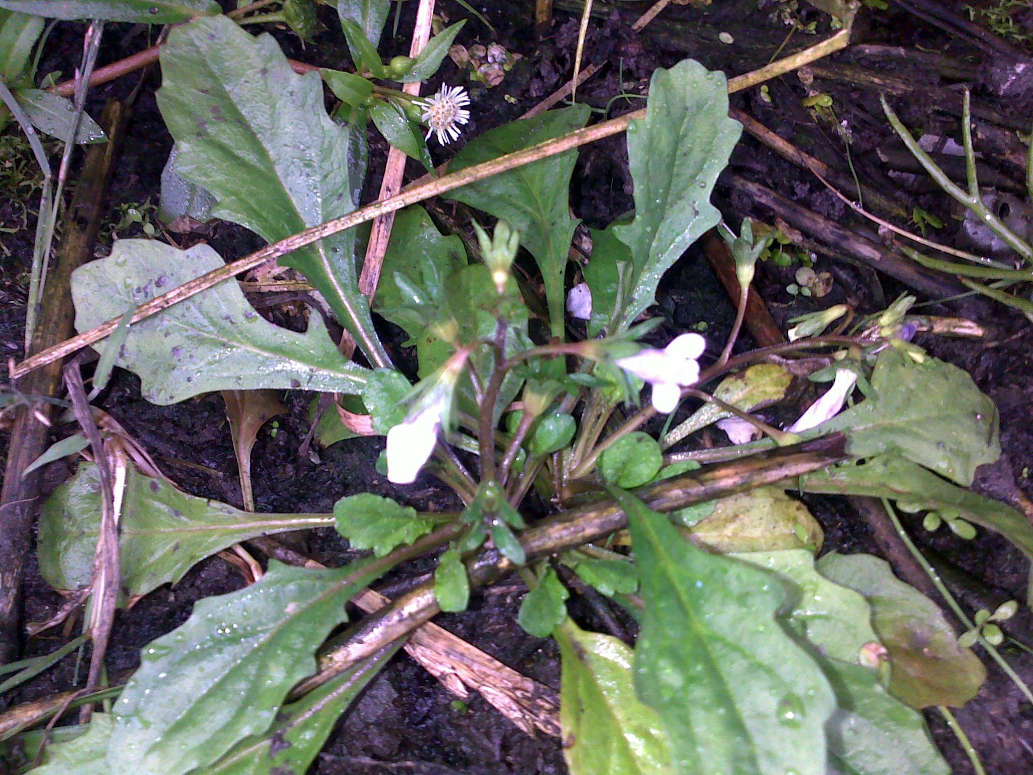 应该是通泉草Mazus pumilus (Burm. f.) Steenis 一年生,无毛或疏生短柔毛。 茎高5-30厘米,直立或倾斜,不具匍匐茎,通常自基部多分支。 叶对生或互生,倒卵形至匙形。长2-6厘米,基部楔形,下延成带翅的叶柄,边缘具不规则粗齿。 总状花序顶生。有时茎仅生1-2片叶即生花;花梗果期长达10毫米,上部的较短;花萼花期长约6毫米,果期多少增大;花冠紫色或兰色,上唇短直,2裂,裂片尖;下唇3裂,中裂片倒卵原型,与萼筒平。 遍布全国。生海拔2500米以下的湿润荒地、路边。 |