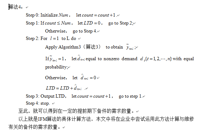 2007年,Z S Hua提出了IFM预测算法[34],该方法将多种影响备件需求发生的因素考虑进备件需求预测中,如装置设备大修安排、检修安排等(这些因素中很多是可以提前预测的),同时,考虑到需求自身数据的特点(如相关性)来预测,与只考虑需求数据自身特性的Bootstrap法相比,IFM预测算法在预测与装置的检修是否相关性的备件的需求量的时候要适用的多。其计算过程是在固定的提前期下,首先是重点确定非零需求中与检修有关的需求数值的分布规律,然后再计算在固定的提前期下备件的需求量。
