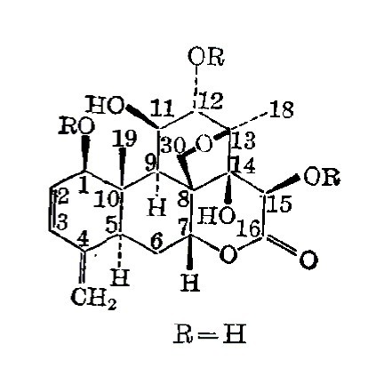 化合物碳谱数据:11.7, 19.6, 28.7, 40.4, 44.3, 46.3, 50.3, 69.6, 70.4, 75.7, 76.6, 79.3, 81.8, 82.2, 84.7, 111.8, 129.7, 132.3, 144.7, 175.3