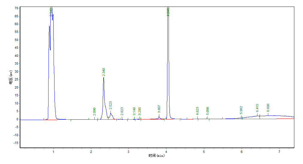 谱图如下,第一个峰本来是丙烯醛的峰,当时有3个锯齿峰,难道是样品不纯还是什么其他的原因。色谱条件:初始柱温100, 汽化260, 检测280, 进样品后程序升温程序:100度保持3min, 然后以30 度/min速度升到160度保持1min,最后以30 度/min速度升到220度保持3min. 进入样品量0.3微升, 丙烯醛浓度大致0.385 mol/L, 真搞不懂是为什么??? |
