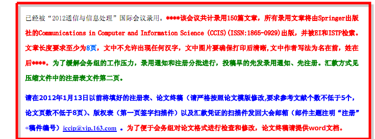 1月3日晚11点投了ICCIP 2012,结果6日就给我发来了录用通知