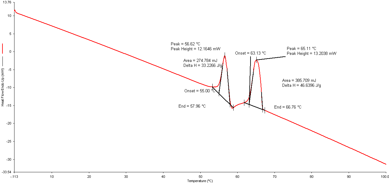 你的升温图形不好看,应该不是液晶,但是有两个晶体的转变温度,降温过程中没有液晶相,强烈建议再做一次DSC,如果有小峰出现,才有可能有液晶相