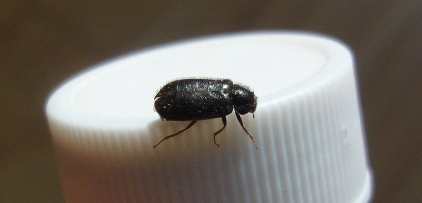 百度知识:http://baike.baidu.com/view/1385712.htm 网目拟地甲Opatrum subaratum 鞘翅目,拟步甲科 主要分布在东北华北、西北,大部分寄生在蔬菜、豆类、小麦、花生等 虫体椭圆形,头部较扁,背面似铲状,复眼黑色在头部下方。触角棍棒状11节,第l、3节较长,其余各节呈球形。前胸发达,前缘呈半月形,其上密生点刻如细沙状。鞘翅近长方形,其前缘向下弯曲将腹部包住,故有翅不能飞翔,鞘翅上有7条隆起的纵线,每条纵线两侧有突起5—8个,形成网格状。前、中、后足各有距2个,足上生有黄色细毛。腹部背板黄褐色,腹部腹面可见5节,末端第2节甚小。卵椭圆形,乳白色,表面光滑,长约1.2—1.5mm,宽约0.7—0.9mm。初孵幼虫体长2.8—3.6mm,乳白色;老熟幼虫体长15—18.3mm,体细长与金针虫相似,深灰黄色,背板色深。足3对,前足发达,为中、后足长度的1.3倍。腹部末节小,纺锤形,背板前部稍突起成一横沟,前部有褐色钩形纹1对,末端中央有隆起的褐色部分,边缘共有刚毛12根,末端中央有4根,两侧各排列4根。蛹长6.8—8.7mm,宽3.1—4mm。裸蛹,乳白色并略带灰白,羽化前深黄褐色。腹部末端有2钩刺。 |