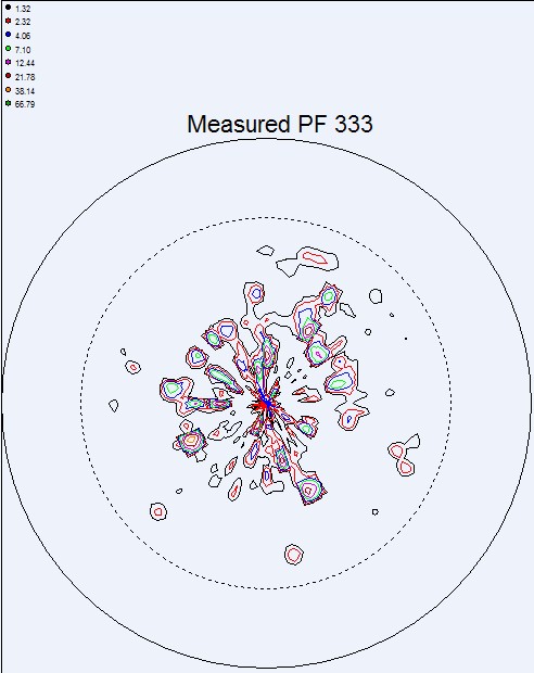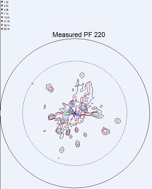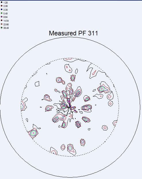 之前做了XRD测试,发现样品中有<111>和<110>的取向存在,然后对这几个样品做了极图,来分析晶体的织构,用的是反射法,反射角度是0-70度,0-360度。但是图出来后不会分析,请高手赐教啊。主要想问图中的织构都是怎么分析的,我就是想说明样品中哪个取向最强,哪个方向的织构最强 |