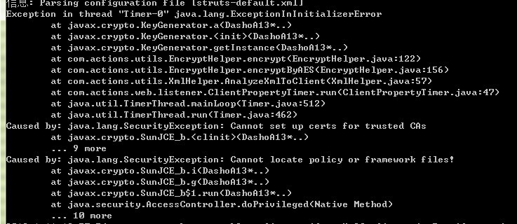 看这错误是KeyGenerator初始化的问题,但是我写了个普通的class类测试的时候,加密是完全正确的,并没出异常。这个错误是我启动tomcat,在监听器里面调用加密的时候出现的错误。图片好像显示不出来,可以到这个地址去看,或者在我下面的附近看:http://hi.csdn.net/attachment/20 ... _1326258683DWgH.jpg [ Last edited by xiaoque on 2012-1-11 at 15:22 ] |