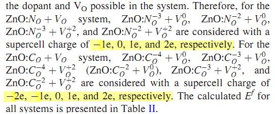 比如N掺杂,如果N掺杂后价态与O类似,即(No-2),则体系仍呈电中性。 若N电负性较强,从别处吸引了一个电子,呈现类似(No-3),则体系显负电-e。 同时,文中似乎认为空位也可以呈现电中性的Vo-0态或正电性的Vo+2态。这两种情况,整个体系分别呈现电中性和正电+2e。 所以体系最终的电荷是上述两个影响因素的共同结果,比如(No-2)+(Vo-0)体系仍保持电中性,(No-3)+(Vo+2)体系呈现+e 碳的情况同理 |