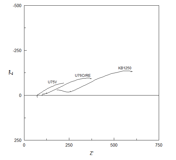 本人金属材料防腐蚀刚入门,如何通过图示的极化曲线和阻抗谱判断三种重轨型号的抗腐蚀性能?个人判断为KB1250>U76CrRE>U75V。腐蚀环境为模拟工业大气,所用腐蚀液为0.01mol/L的亚硫酸氢钠溶液,腐蚀时间为120h,谢谢