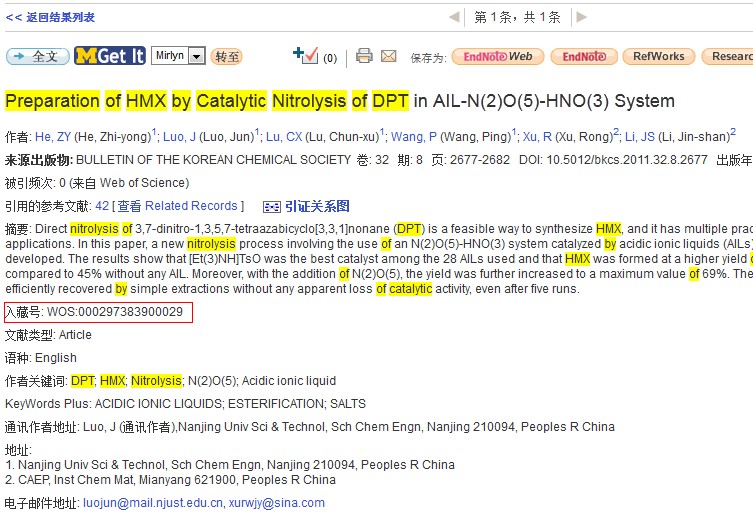 求助一篇文章的SCI号或EI号。信息如下: 题目:preparation of HMX by Catalytic Nitrolysis of DPT in AIL-N2O5-HNO3 System 作者:Zhi-yong He, Jun Luo, Chun-xu Lü, Ping Wang, Rong Xu,and Jin-shan Li 期刊:Bull. Korean Chem. Soc. 2011, Vol. 32, No. 8 ,2677-2682. 期刊链接:http://newjournal.kcsnet.or.kr/m ... amp;vol=32&no=8 |