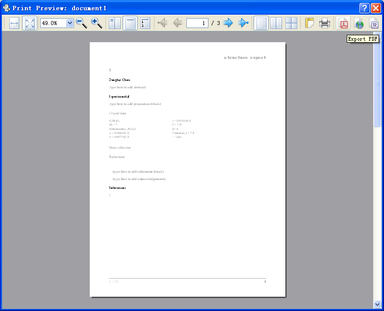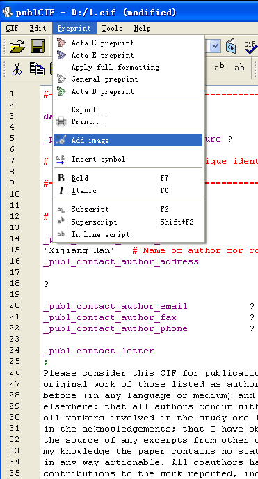| 使用pubcif软件,把晶体cif导入,出现相关数据和内容,请问一下高手,如何把这些内容保存成文档,发表acta E文章,本人是第一次发表acta E ,请指教。 |