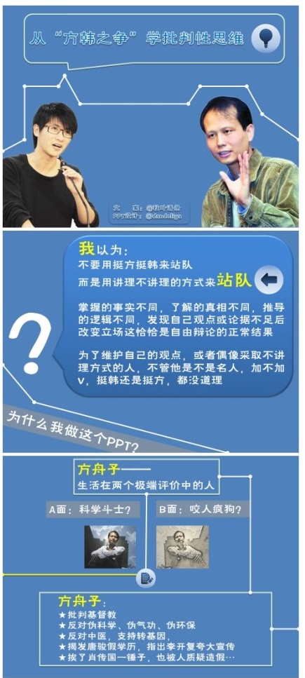最近这几天方舟子VS韩寒大战闹得沸沸扬扬,吸引了学术界、娱乐圈和司法界等社会的广泛关注,可谓总说纷纭见仁见智。不知道你是如何看待分析这个问题的呢? 《说服力-让你的PPT会说话》作者制作了一个精美的PPT,给出了至今为止我看过的最透彻的分析。这个PPT在教给我们独立思考的同时也让我们见识了PPT的制作威力。 http://weibo.com/1280110097/y3l4vu0x0 @秋叶语录(武汉工程大学老师,《说服力-让你的PPT会说话》作者):【看方韩大战学独立思考】 最近能码字的人都为方韩搞写作比赛,我本来不想凑这个热闹,怕人说借势营销。网友@李运丰 希望我做一个PPT用于他开学第一课教学,引导大学生独立思考,我尝试做了一个构思,整个PPT制作99%由@Dandoliya 完成,请用2007版本播放观看 截图1-3 截图4-6[ Last edited by anyluk on 2012-2-29 at 18:52 ] |