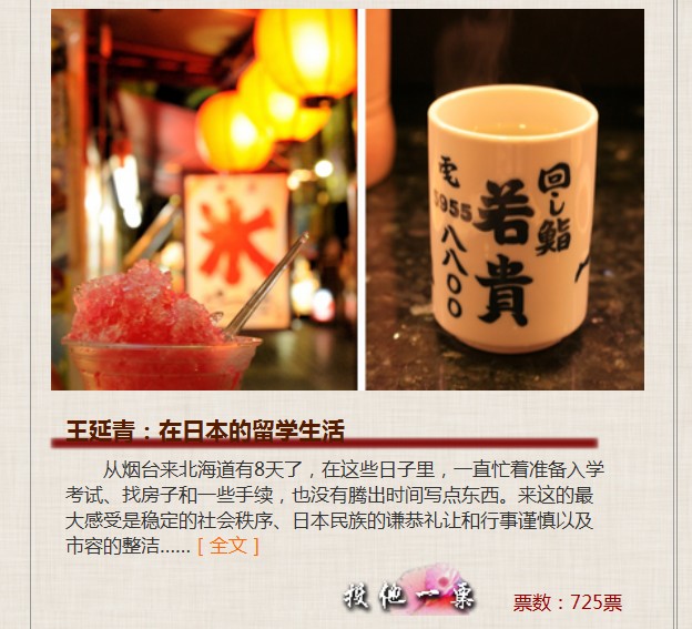 在日本留学已近一年时间,这期间有很多的心酸只有在国外经历多的人才知道,《神州学人》网站上发表一篇小文章,写了一些关于我的留学生活状态并参与评选,希望大家多多支持我哦~~O(∩_∩)O~~ 距截止日期只剩三天啦 网址如下: http://xfdgd.chisa.edu.cn/vote/ 王延青——点击投他一票即可,谢谢~~~~~ 再次谢谢你们的帮助~~~!!! ![]() [ 来自科研家族 快乐检索 ] [ Last edited by wangyanqing110 on 2012-2-9 at 12:01 ] |