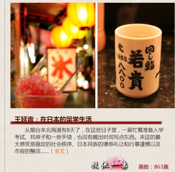 实验室一位师兄在日本留学已近一年时间,这期间有很多的心酸只有在国外经历多的人才知道,《神州学人》网站上发表一篇小文章,写了一些关于他的留学生活状态并参与评选,希望大家多多支持哦~~O(∩_∩)O~~ 网址如下: http://xfdgd.chisa.edu.cn/vote/ 王延青——点击投他一票即可,谢谢~~~~~ 再次谢谢你们的帮助~~~!!! [ Last edited by 0402605863 on 2012-2-9 at 11:04 ] |