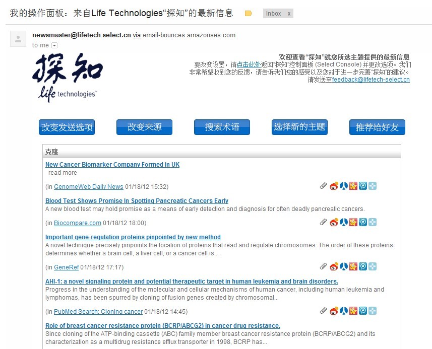Life Technologies“探知”(lifetech-select点cn)是一个新型的文献搜索网站,用于搜索最新的行业内论文和发展咨询。“探知”可让您简单、快速地设置您希望“探知”监测的搜索领域和检索关键词,以及任意数量的刊物。 “探知”会根据搜索条件筛选出清晰易懂的论文摘要,连同全文链接一起每天发送到您的收件箱。方便的帮助您加快研究进程和新闻阅读。“探知”提供的这种自定义搜索方式意味着您仅会收到与研究相关的论文,不会收到不相关的内容。 Select服务是完全免费的,您可以订阅任意数量的期刊,设定任意数量的搜索领域和检索关键词。Select使用了RSS spidering网络爬虫技术,不间断的监测着200多家生命科学期刊和文库,包括PubMed,Nature,Biocompare.com,Bioforum及Biotech Transfer Week等等。 注册及设置会仅花费您5分钟的时间,并且您可以随时更改这些信息。如果您有任何的意见或建议,请随时发给我们,我们会非常愿意改进!您可以在这里回复您的意见及建议,或者发送email至 haoli@lifetech-select.com 注册地址(由于链接地址为敏感词,请大家把“点cn”自行更换,谢谢!): http://www.lifetech-select点cn/?utm_source=forum&utm_medium=social&utm_campaign=f130emuch (PS:我们的中文域名为:www.lifetech-select点cn。由于我们的select探知搜索网站还在推广阶段,所以我们希望可以跟踪新注册用户的来源。以上的网址是由google url builder所提供的链接,包含了我们需要的一些信息,会指向与我们的域名相同的地址。所以如果您可以点击该链接来访问select进行注册,我们就可以统计我们的新用户是在哪些论坛/子论坛中看到我们的推广贴子。我们会十分感激您的配合和支持的!谢谢!) 谢谢大家的支持! 欢迎任何意见和建议! Life technoliges [ Last edited by 探知select on 2012-2-9 at 06:53 ] |