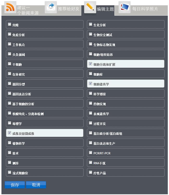 我们的微博与人人主页上会每日更新一些Select上的小故事与文章。内容是英文,可以更方便的了解行业内最新资讯与技术。如果感兴趣的话,欢迎关注! 新浪微博: @gibco @LifeTechnologies新闻 或者搜索 #Select小故事# 人人公共主页: 英潍捷基 下面是一些Select小故事的示例: #Select小故事#:解析男性行为和女性行为 http://t点cn/zOha43t #Select小故事#:贫血会让中风死亡的风险提高三倍甚至更多 http://t点cn/zOh1TT0 #Select小故事#:前列腺的基因活动与大量锻炼有关 http://t点cn/zOhxGDw 请大家多多支持,注册之后选择您感兴趣的研究方向,与期刊,即可根据您的设定收到每日邮件提醒 |