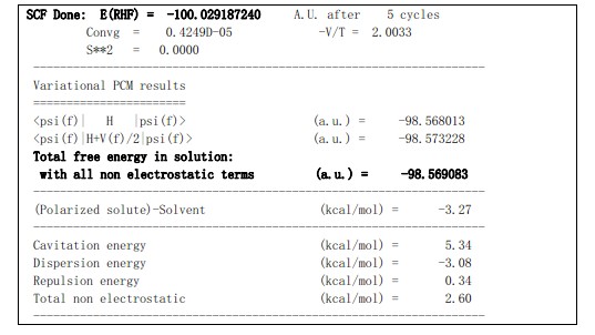 输出文件一般都有: After PCM corrections, the SCF energy is ...., 这个数值是: SCF Done: E(RHF) = ... A.U. after 5 cycles 的结果.