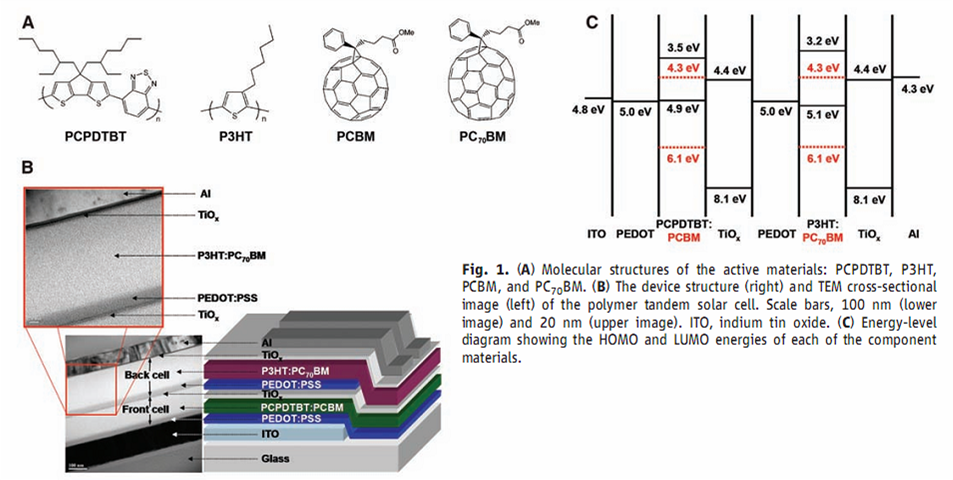 串联结构,好像是两个是两个电池串联吧,空穴和电子在各自的电池内(front cell 和 back cell)内分离,中间的TiOx是作为导线之类的,使两个电池串联起来,串联结构是电压增加,但不能使电流增加