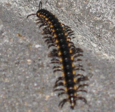 马陆有1万多种(包括蜈蚣),这个是粗直形马陆(Asiomorpha coarctata)。它的体型较小,成虫的体长约3公分左右,身体呈背腹扁平的形状,身体的背板为黑色,每个体节两边各有一鲜黄色的斑块。是最为常见的马陆之一。
